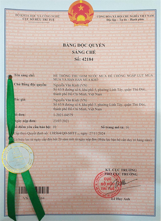 Sáng chế Hệ thống thu gom nước mưa để chống ngập lụt mùa mưa và hạn hán mùa khô ra đời với mục đích thu gom nguồn nước mưa dồi dào để ngăn ngừa hạn chế nước chảy tràn trên mặt đất gây xói mòn, sạt lở, lũ quét, ngập lụt, ô nhiễm môi trường vào mùa mưa và dự trữ nước cho mùa khô góp phần đảm bảo an ninh nguồn nước. Ngoài ra hệ thống còn giúp ngăn ngừa hạn chế sụt lún đất do tụt mạch nước ngầm, góp phần điều hòa ổn định nhiệt độ và độ ầm giữa ban ngày và ban đêm, giữa các mùa trong năm và thích nghi với biến đổi khí hậu.